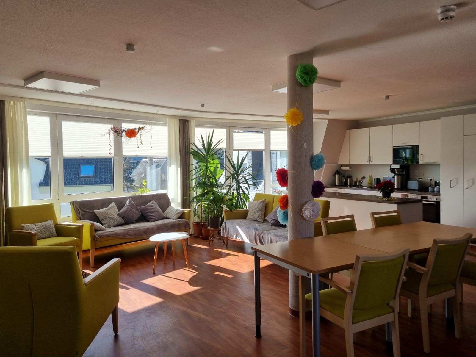 Beide Wohnbereiche sind jeweils mit einem großen Gemeinschaftsraum und komplett eingerichteter Einbauküche und angrenzendem Balkon ausgestattet. Jeder Wohnbereich hat ein großes Stationsbad mit einer Pflegewanne, Dusche und WC. Im Erdgeschoss neben dem modern eingerichteten Foyer befindet sich ein großer Gemeinschaftsraum für Begegnungen, z. Bsp. mit Angehörigen, Durchführung von saisonalen Feierlichkeiten (Frauentag, Fasching, etc.).